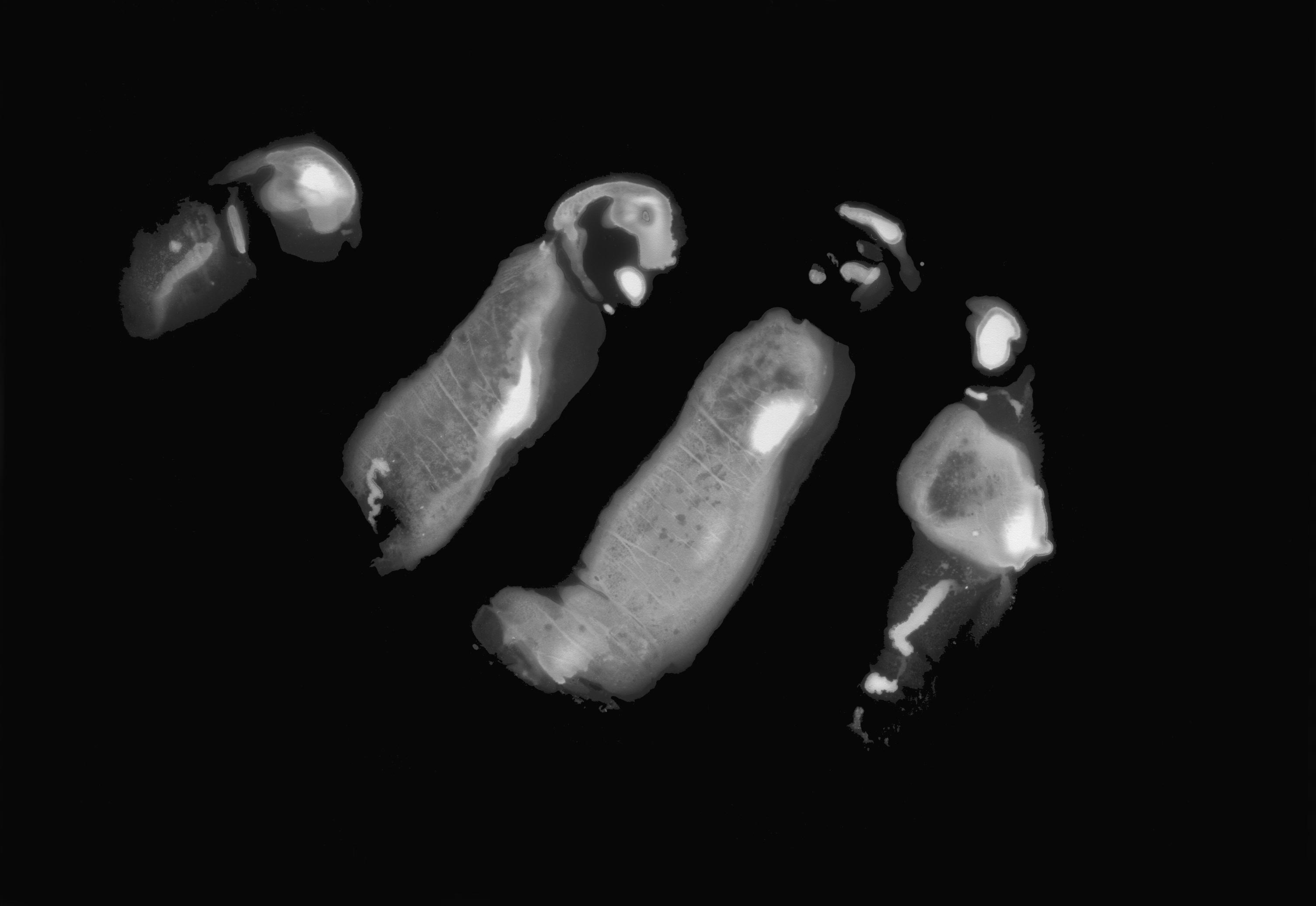 Ici, les corps s’exposent dans le papier qui les enroule, ils y laissent une infime trace d’eux-mêmes, échangeant des grains charnels pour des grains argentiques, dans une lente fossilisation, exprimée, moulée par les mains de l’auteur autant sculpteur que photographe.